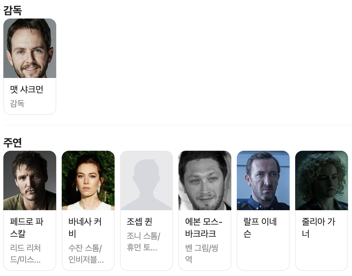 - 주연 : 페드로 파스칼, 바네사 커비, 조셉 퀸, 에본 모스 바크라크, 랄프 이네손 등