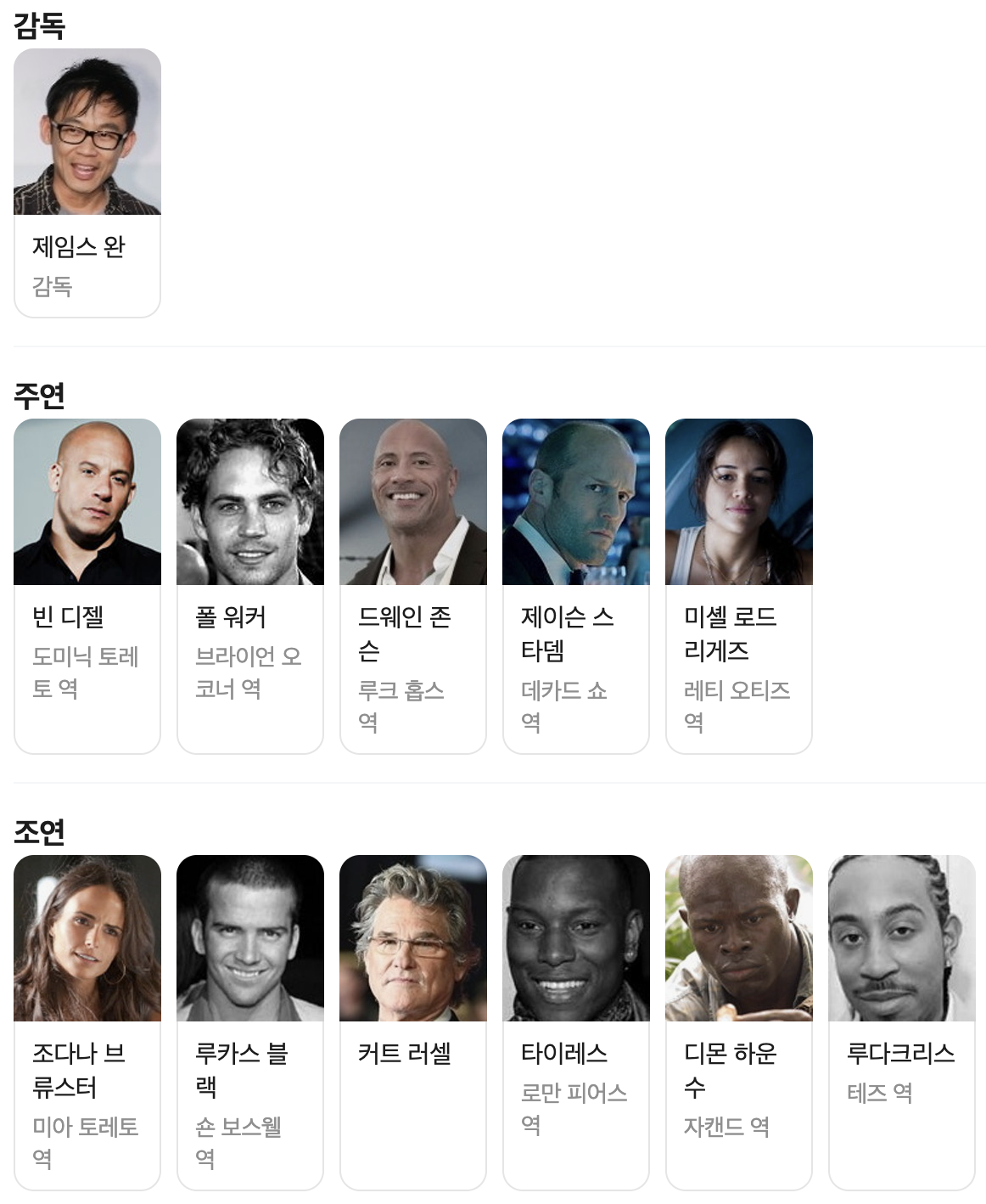 - 출연 : 빈 디젤, 폴 워커, 드웨인 존슨, 제이슨 스타뎀, 미셸 로드리게즈, 조다나 브류스터, 타이레스, 루다크리스 등