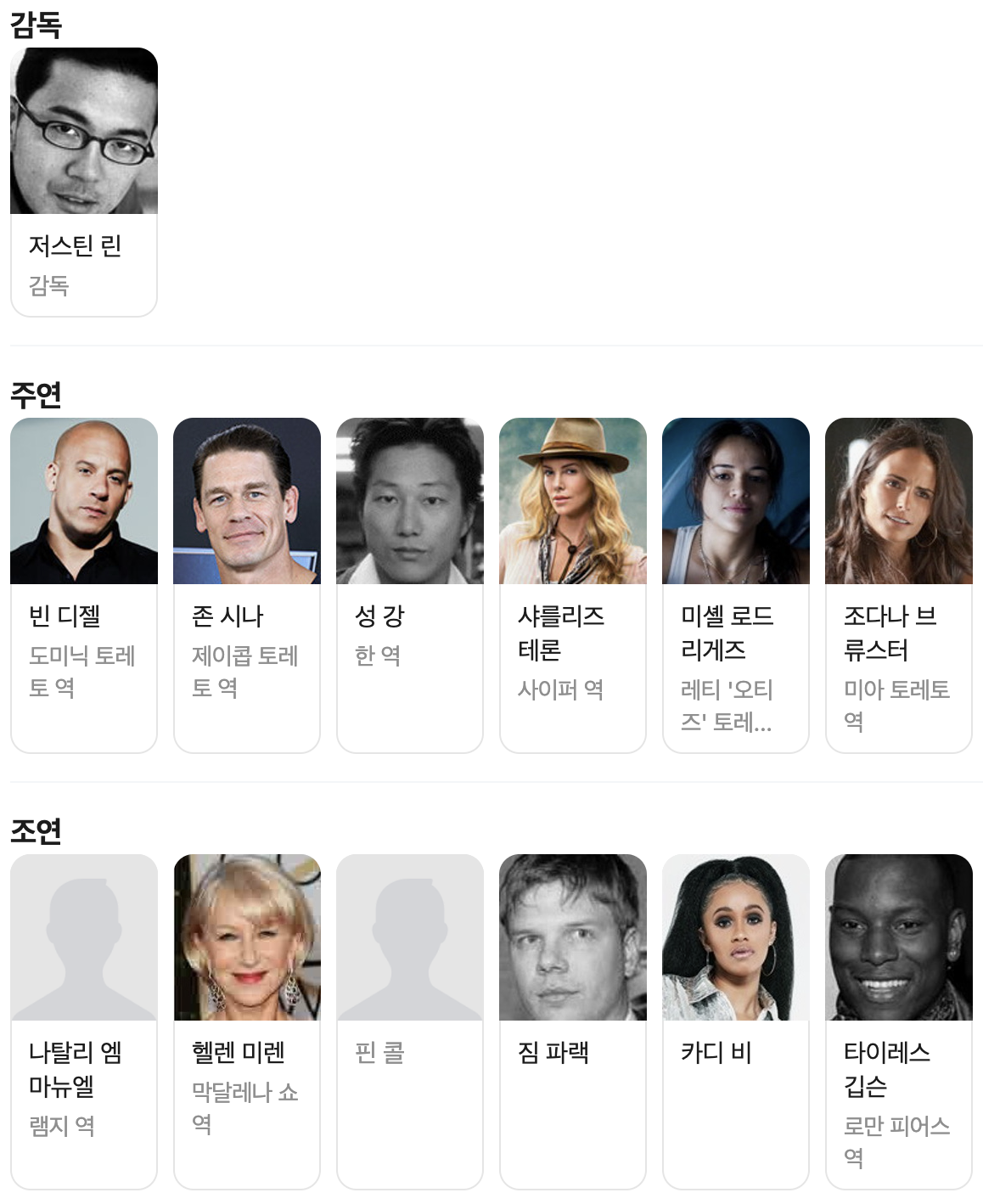 - 출연 : 빈 디젤, 존 시나, 성 강, 샤를리즈 테론, 미셸 로드리게즈, 조다나 브류스터, 타이레스, 루다크리스 등