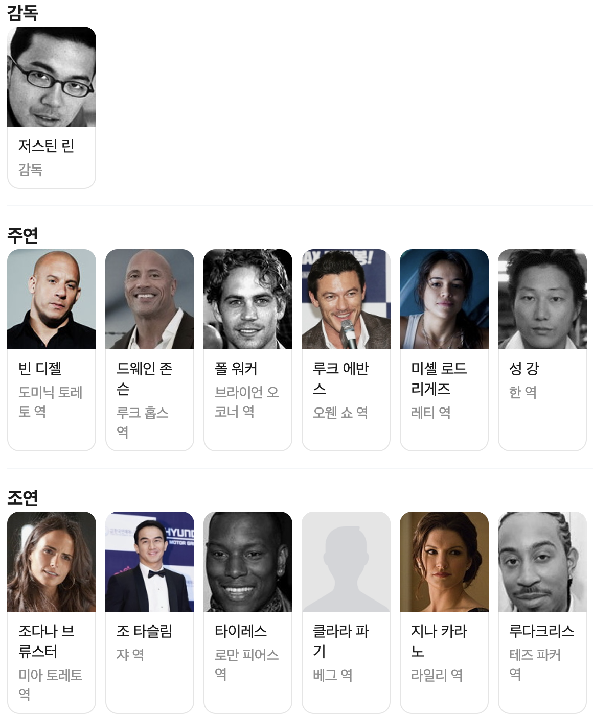 - 출연 : 빈 디젤, 드웨인 존슨, 폴 워커, 루크 에반스, 미셸 로드리게즈, 성 강, 갤 가돗, 조다나 브류스터, 타이레스, 지나 카라노, 루다크리스 등