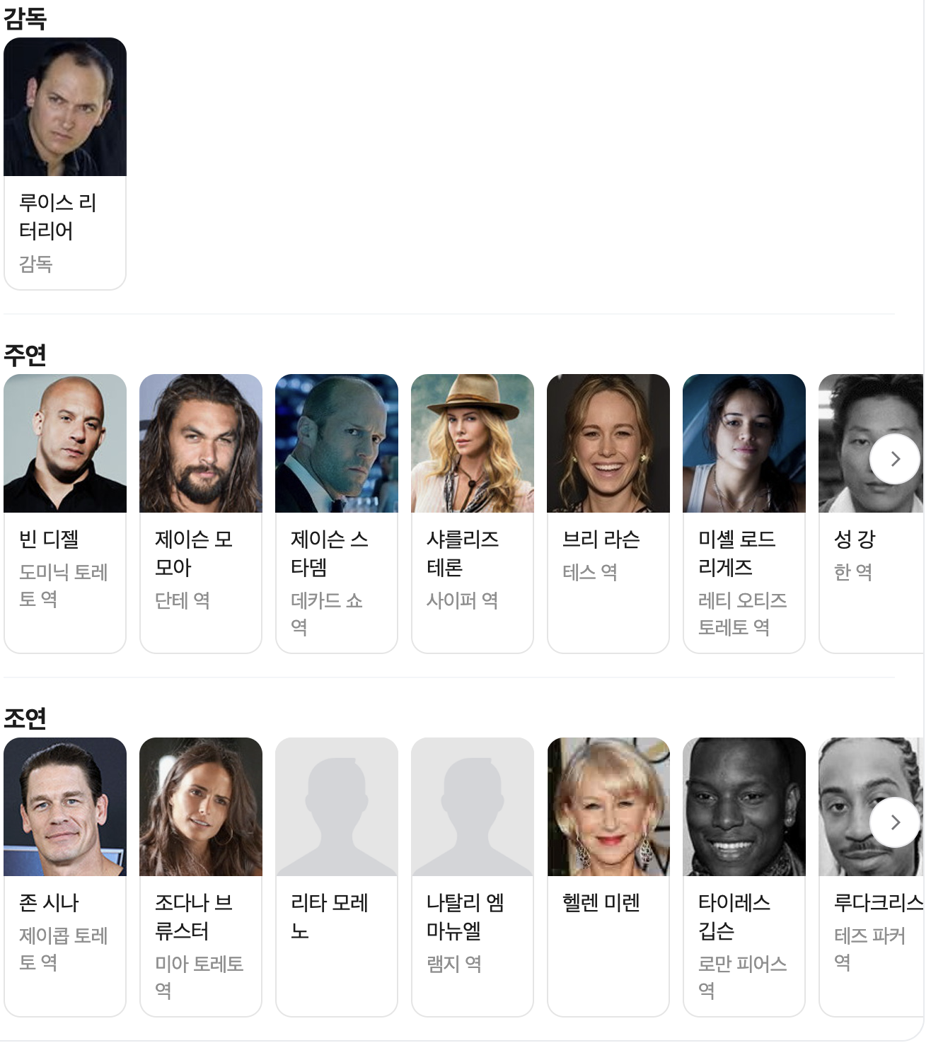 - 출연 : 빈 디젤, 제이슨 모모아, 제이슨 스타뎀, 샤를리즈 테론, 미셸 로드리게즈, 성 강, 존 시나, 조다나 브류스터, 타이레스, 루다크리스 등