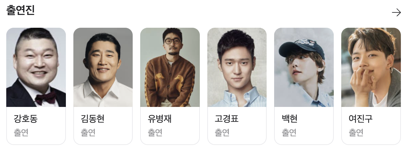 - 출연 : 강호동, 김동현, 유병재, 고경표, 백현, 여진구