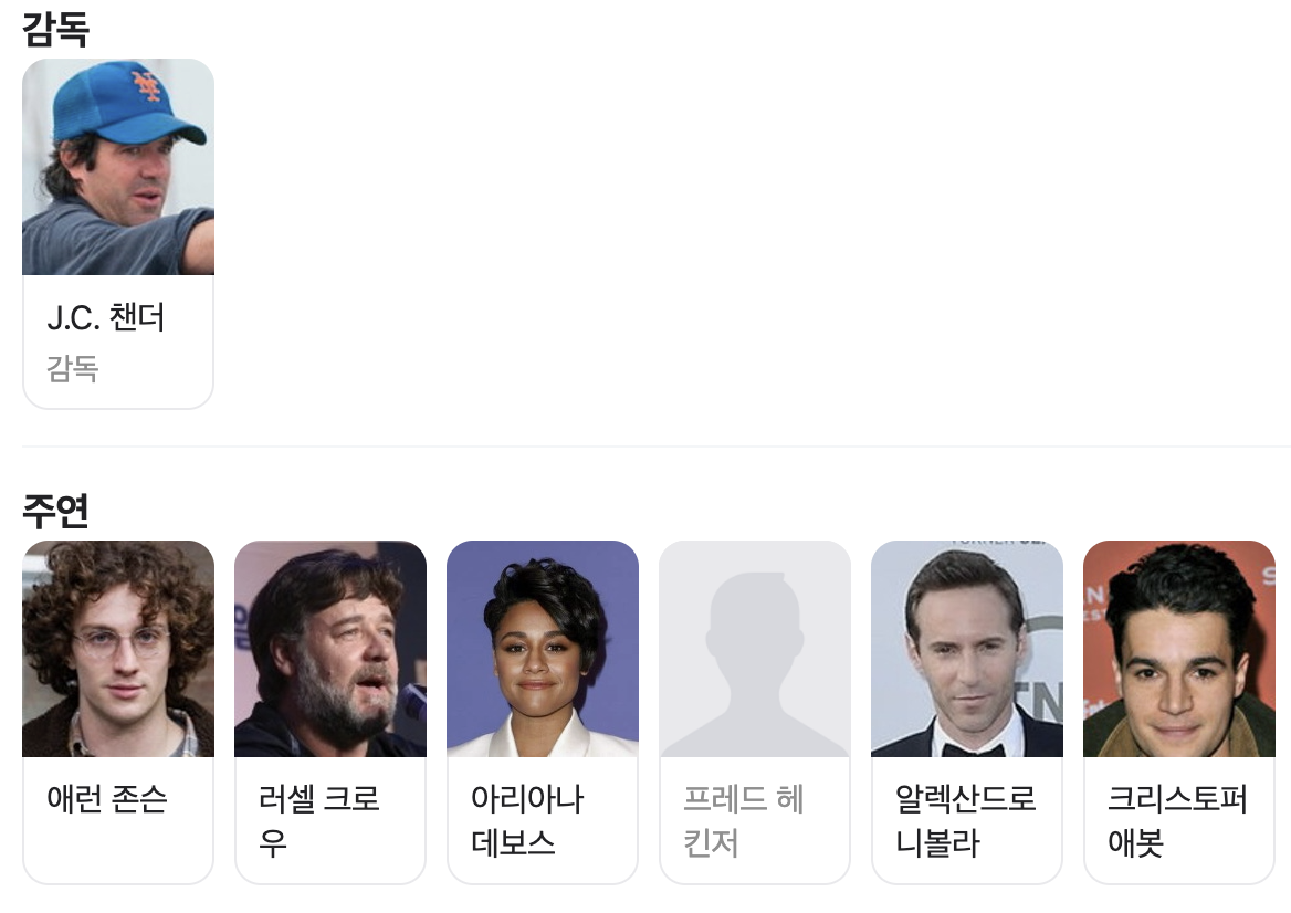 - 주연 : 애런 존슨, 러셀 크로우, 아리아나 데보스, 프레드 헤킨저, 크리스토퍼 에봇, 알렉산드로 니볼라 등