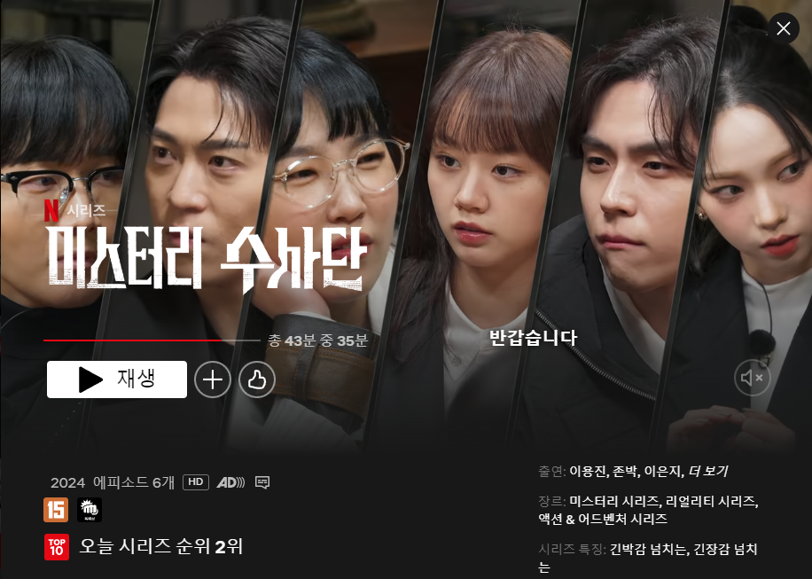 넷플릭스 '미스터리 수사단' 시즌1은 한국 예능이 보여줄 수 있는 실험성과 글로벌 스트리밍 플랫폼 넷플릭스가 가진 자본력·연출력이 결합한 결과물이라 할 수 있습니다. 프로그램은 시청자에게 단순한 소비가 아닌 ‘참여와 사고’를 요구하며, 이는 예능의 지평을 확장하는 긍정적인 시도였다고 생각합니다. 이런 방대한 스케일과 탁월한 연출력은 국내뿐 아니라 해외 시청자들 까지도 ‘K-예능’에 빠져들게 만들기 충분했을 것이라 생각되네요. 시즌2가 시작되기 전에 '미스터리 수사단' 시즌1 정주행은 어떠신가요? 넷플릭스를 통해 다시보실 수 있습니다. 감사합니다.