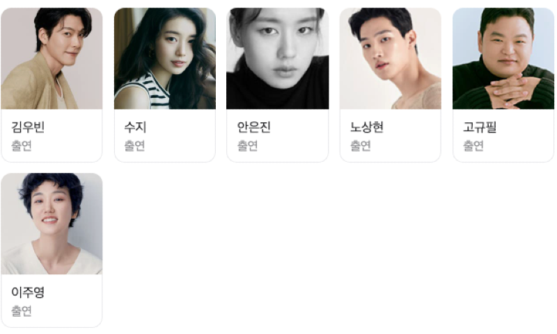 - 출연 : 김우빈, 수지, 안은진, 노상현, 고규필, 이주영 등