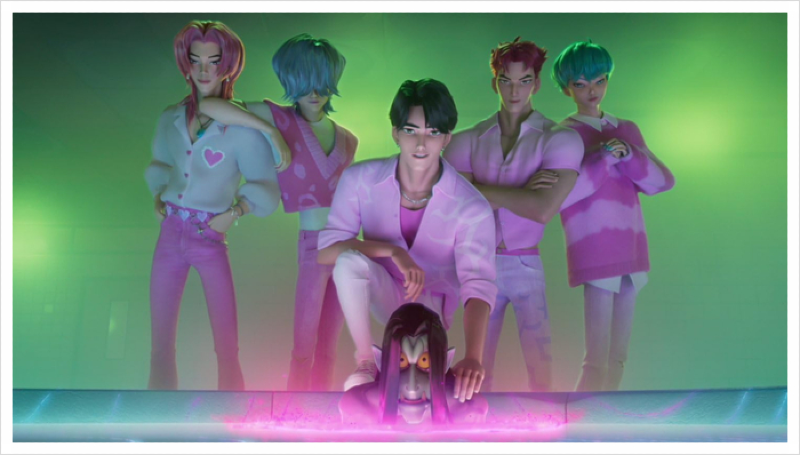라이벌인 Saja Boys는 데몬을 숨긴 아이돌 남자 그룹입니다. 이들을 통해 뮤직 산업의 유혹과 팬덤의 어두운 면을 시각적 메타포로 풀어내었던 것 같습니다. 그들의 무대가 ‘허상과 착시’라면, 주인공들의 무대는 진정성과 공감의 힘을 강조했습니다. 음악을 무기로, 정체성을 무대로 놓는 이 구성은 탁월했던 것 같아요!