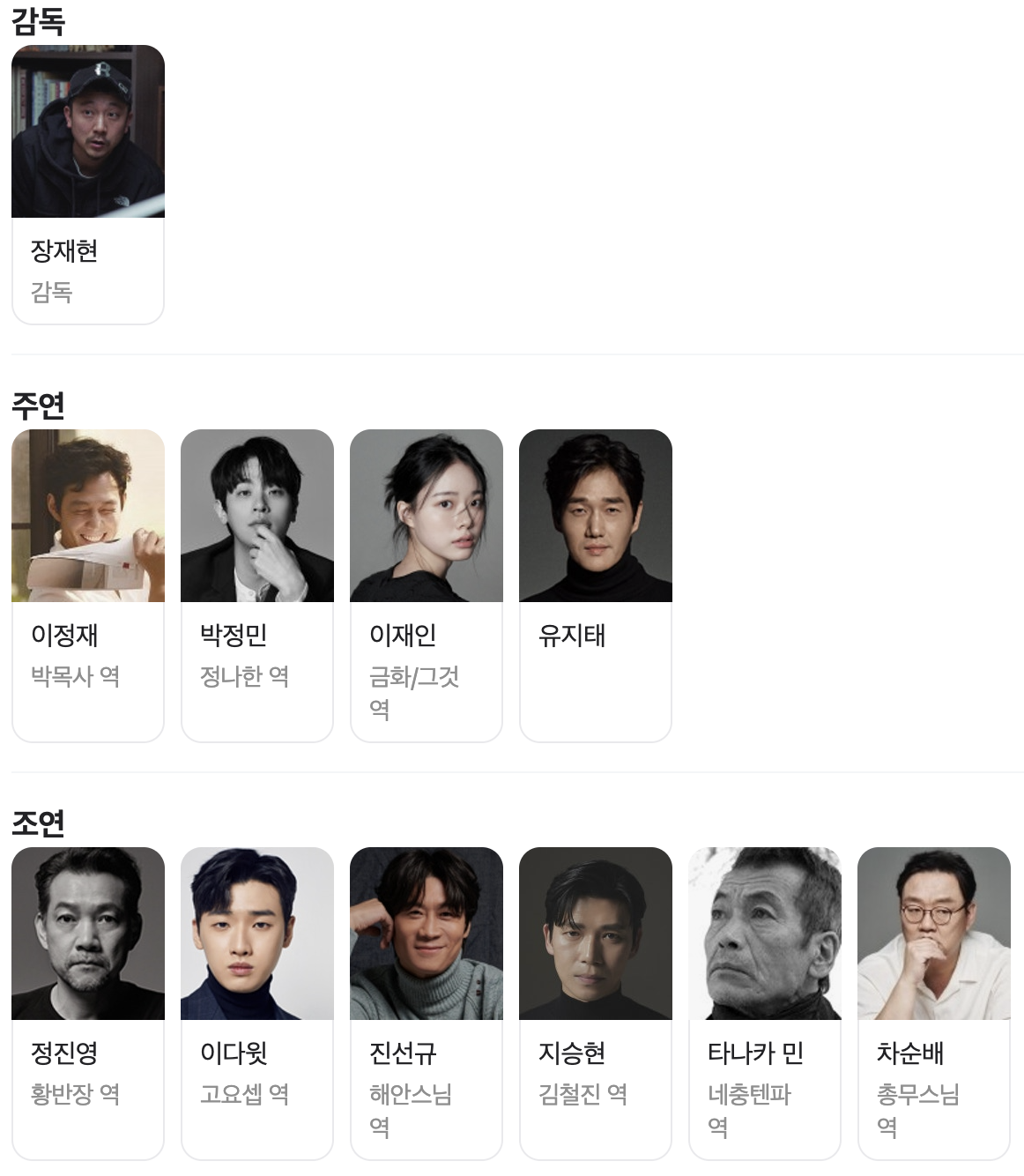 - 출연 : 이정재, 박정민, 이재인, 유지태, 정진영, 이다윗, 진선규 등