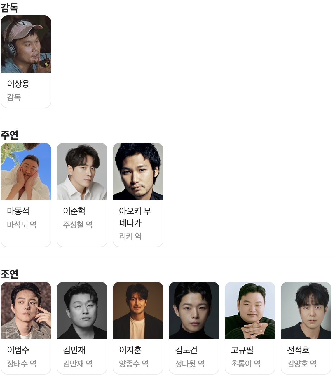- 출연 : 마동석, 이준혁, 아오키 무네타카, 이범수, 김민재, 고규필 등